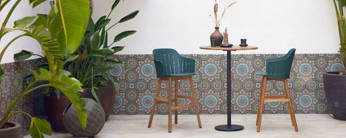Une table de bar élégante avec deux chaises vertes, décorée d'un vase et d'une tasse, entourée de carreaux décorés et de plantes luxuriantes.