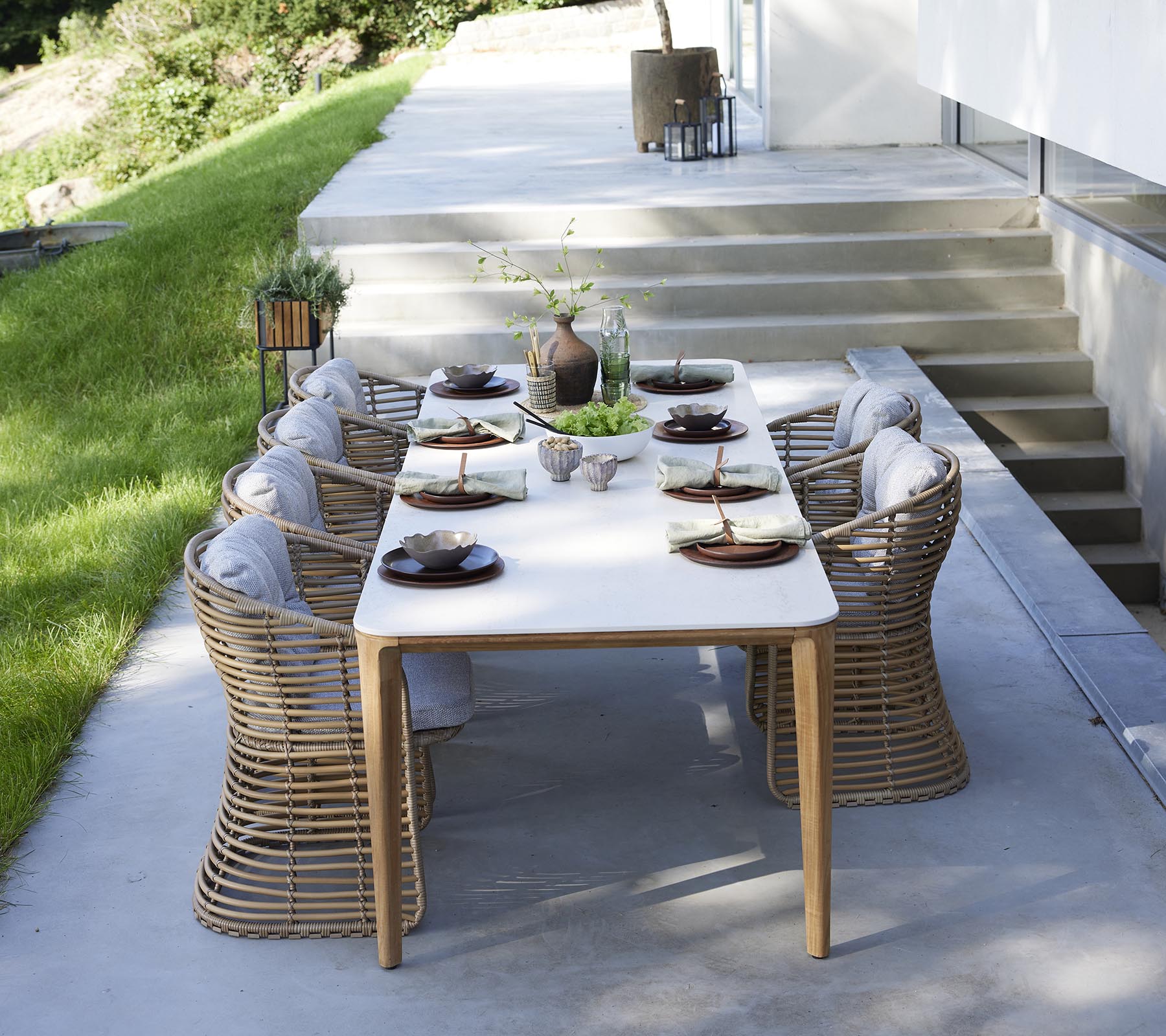 Aspect 280 x 100 cm. est une table d’une qualité exceptionnelle, dans des matériaux durables et élégants. Aspect combine l’éclat et la chaleur du teck, avec des céramiques propres et solides. La table Aspect est conçue par l’équipe de Cane-line Design, qui ont mis l’accent sur la création d’une gamme unique de tables qui peuvent correspondre à la collection croissante de chaises haut de gamme pour l’extérieur. Aspect se compose d’un cadre en teck, d’un noyau en aluminium massif et d’un dessus de table élégant en céramique. Le teck Cane-line est approuvé et cultivé selon le système de certification SVLK. L’association du bois et de la céramique confère une expression exclusive et raffinée qui peut définir le cadre d’une fantastique salle à manger extérieure.