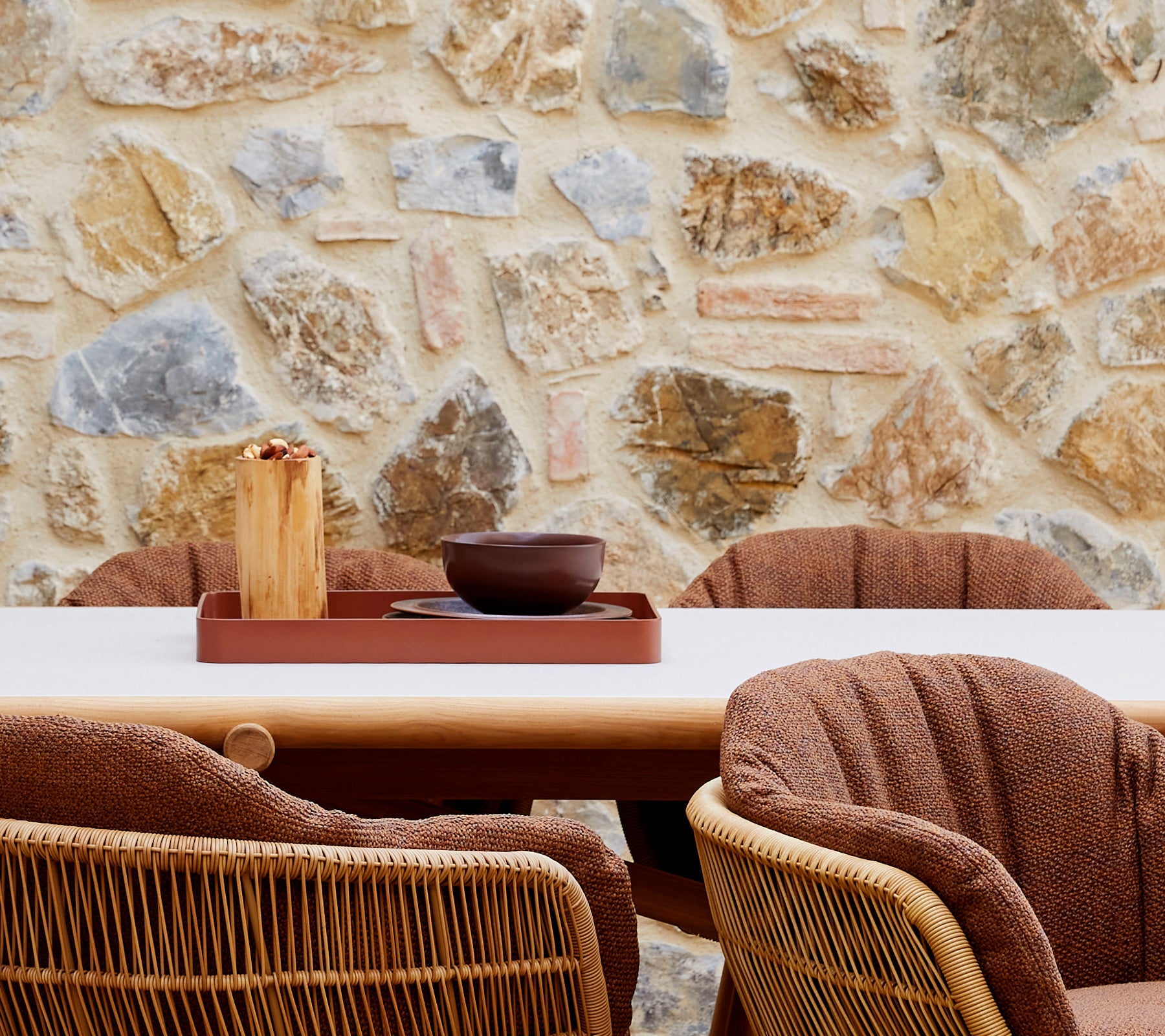 Cadre extérieur moderne avec une table blanche, des chaises blanches et des éléments décoratifs marron.