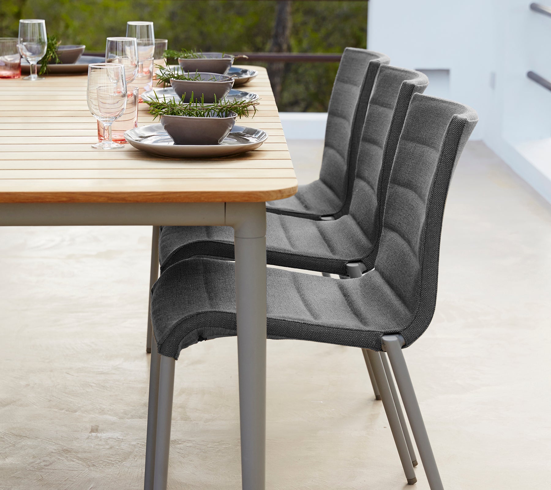 La composition des matériaux confère à la collection Core une esthétique chaleureuse et légère tout en conservant une impression de solidité. La structure est réalisée à partir de profils spécialement conçus pour assurer une construction robuste et une finition élégante. Le teck est un bois naturellement riche en huiles, idéal pour une utilisation en extérieur, qui développe au fil du temps une belle patine gris argenté ; toutefois, il est possible de préserver son éclat d’origine grâce à des produits d’entretien adaptés.
