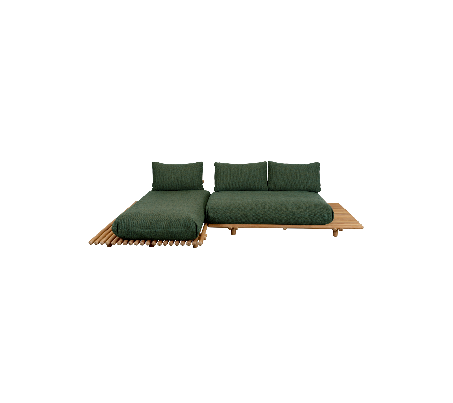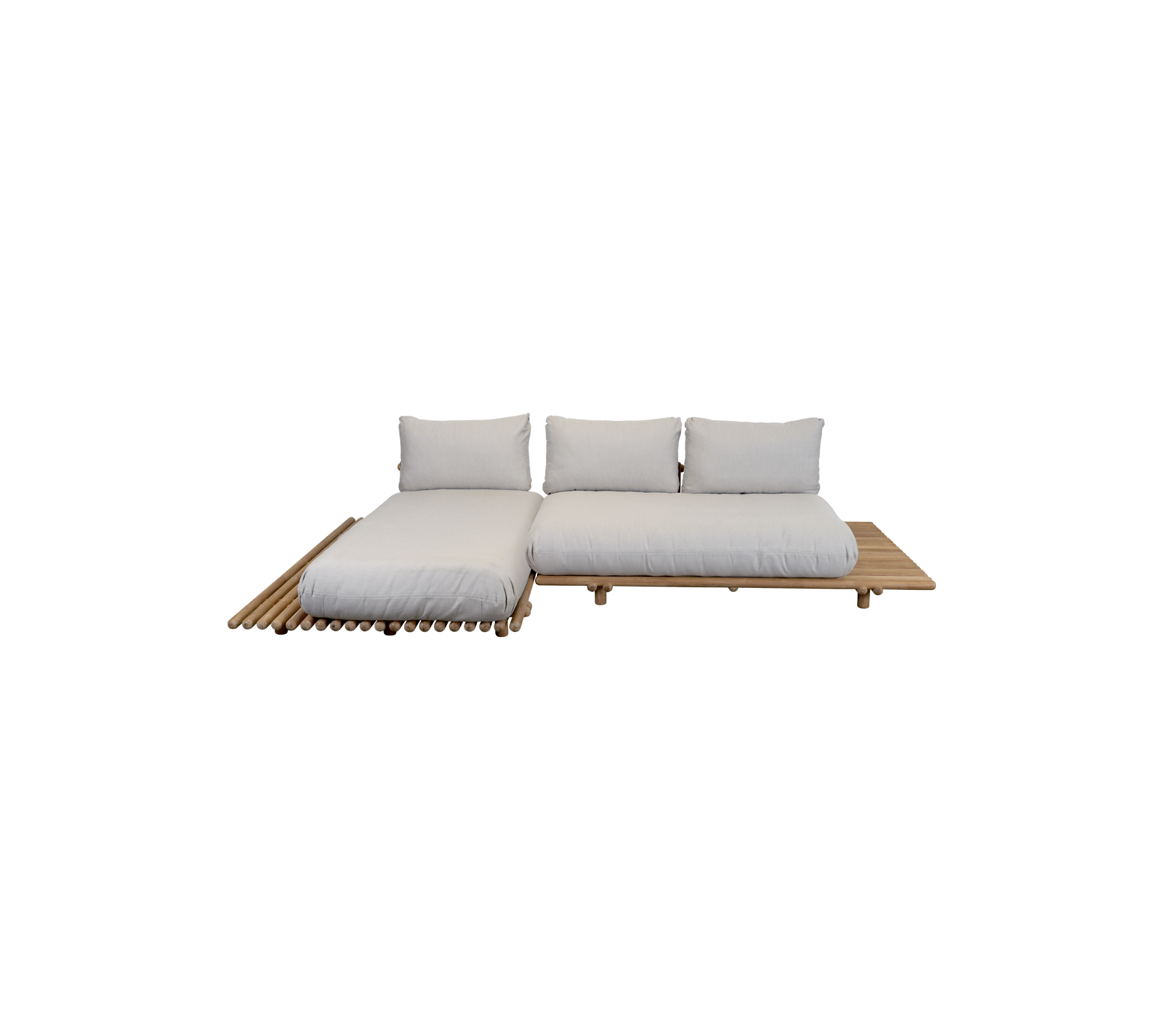 Le canapé Sticks Platform avec chaise longue, composé de deux modules de canapé, est un choix polyvalent conçu pour s’adapter aux espaces plus petits tout en maximisant le confort et le style. Cette configuration compacte offre l’endroit idéal pour des moments de détente décontractés, que ce soit en solo ou en partageant un moment calme avec un proche. Sa structure durable est disponible en teck certifié, connu pour développer une patine gris argenté avec le temps ; utilisez les produits d’entretien pour teck de Cane-line si vous souhaitez préserver la couleur dorée d’origine. La structure est également disponible en aluminium thermolaqué, offrant une grande résistance aux intempéries et nécessitant peu d’entretien.